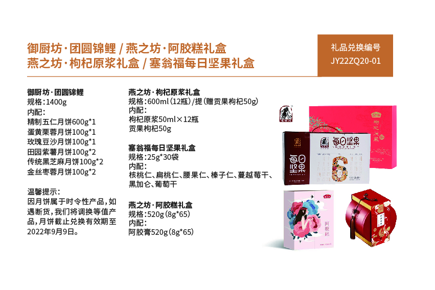 JY22ZQ22-01-御厨坊·团圆锦鲤 月饼礼盒+燕之坊·阿胶糕礼盒+燕之坊·枸杞原浆礼盒+塞翁福每日坚果礼盒