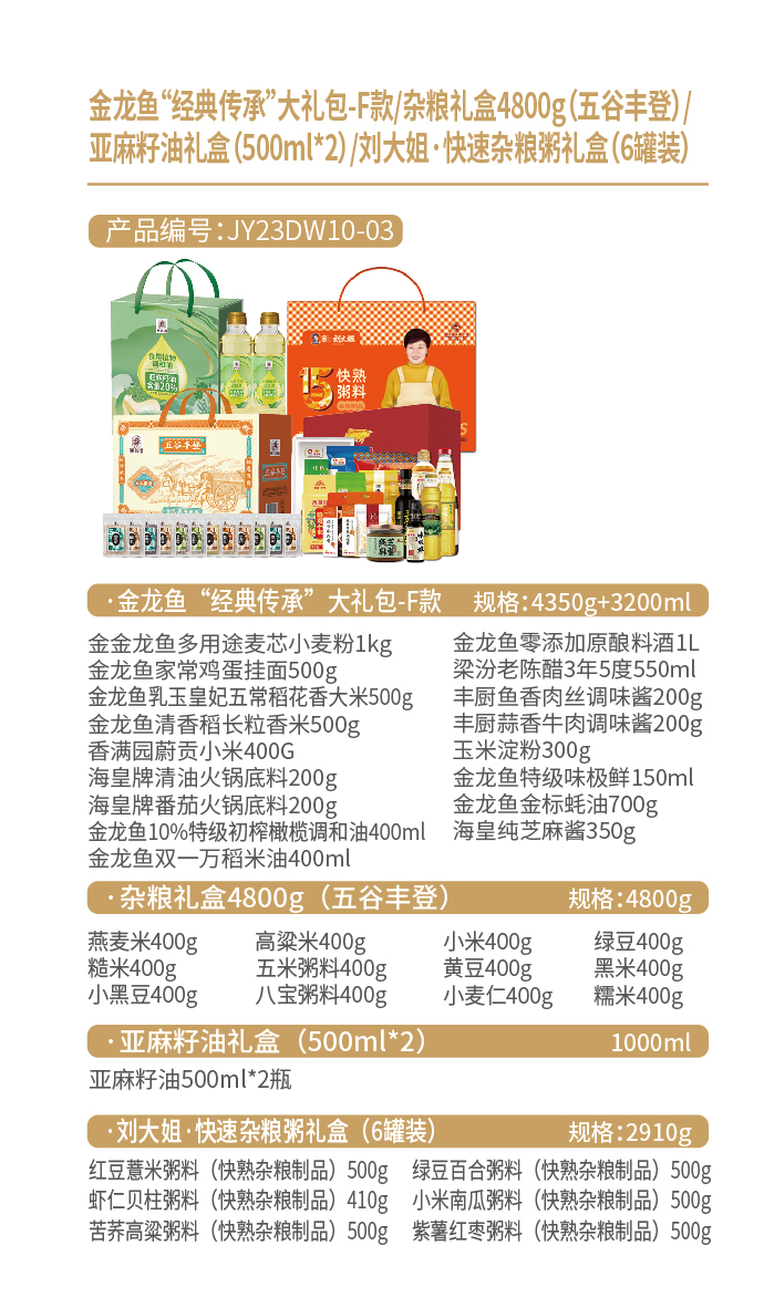 JY23DW10-03-金龙鱼“经典传承”大礼包-F款+杂粮礼盒4800g(五谷丰登)+亚麻籽油礼盒 (500ml*2)+刘大姐·快速杂粮粥礼盒 (6罐装)