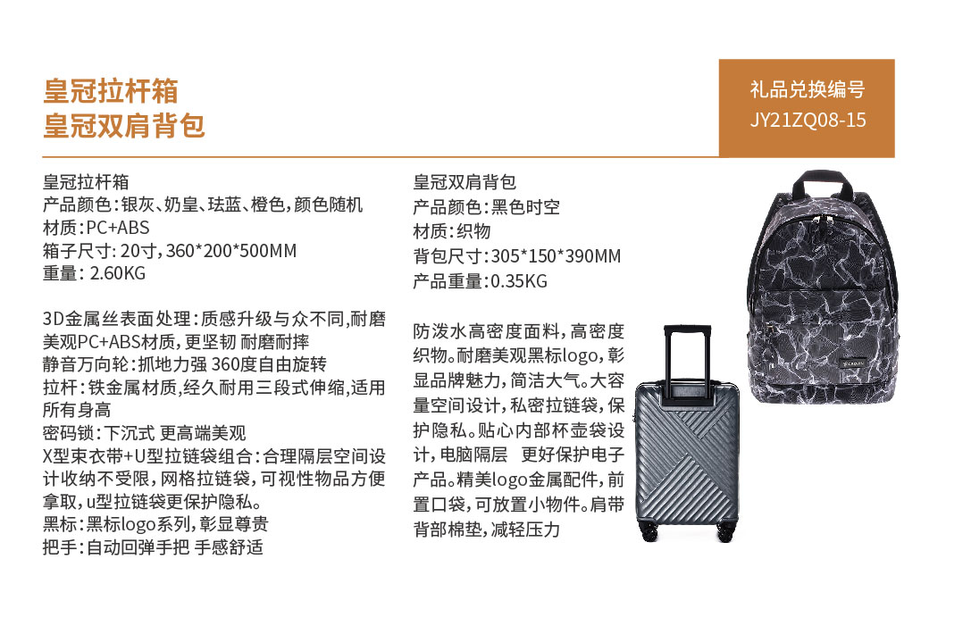 JY21ZQ08-15-皇冠CROWN 拉杆箱C-F2010H/20+皇冠双肩背包E-P1122S/15