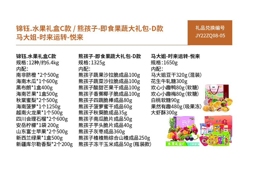 JY22ZQ08-05-锦钰.水果礼盒C款+熊孩子-即食果蔬大礼包-D款+马大姐·时来运转-悦来