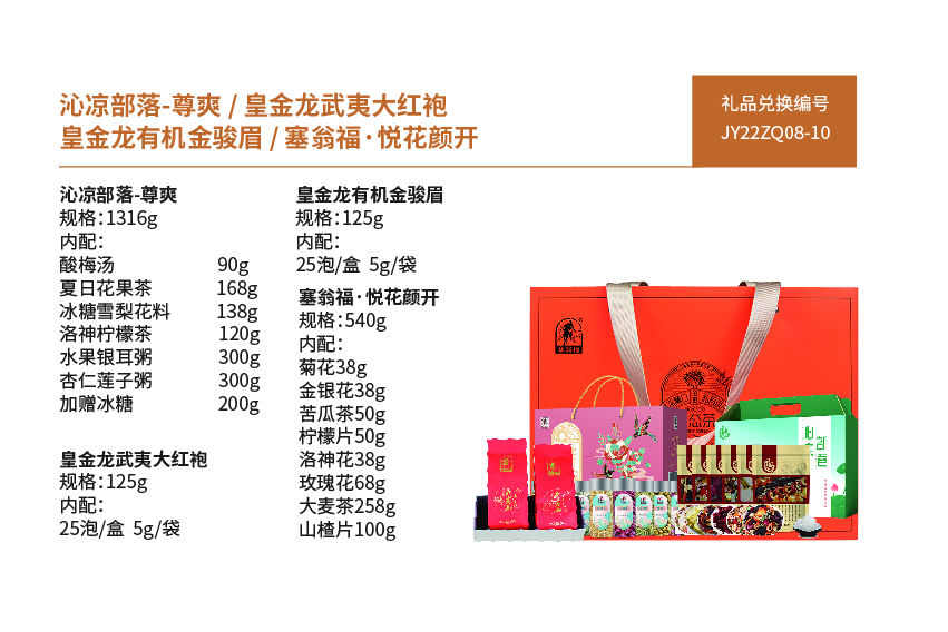 JY22ZQ08-10-沁凉部落-尊爽款+皇金龙武夷大红袍+皇金龙有机金骏眉塞翁福·悦花颜开
