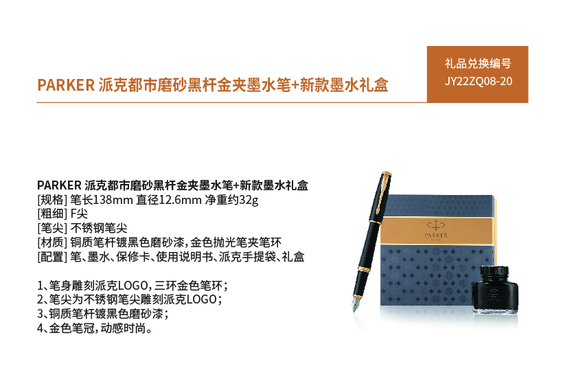 JY22ZQ08-20-PARKER 派克2016都市磨砂黑杆金夹墨水笔+新款墨水礼盒